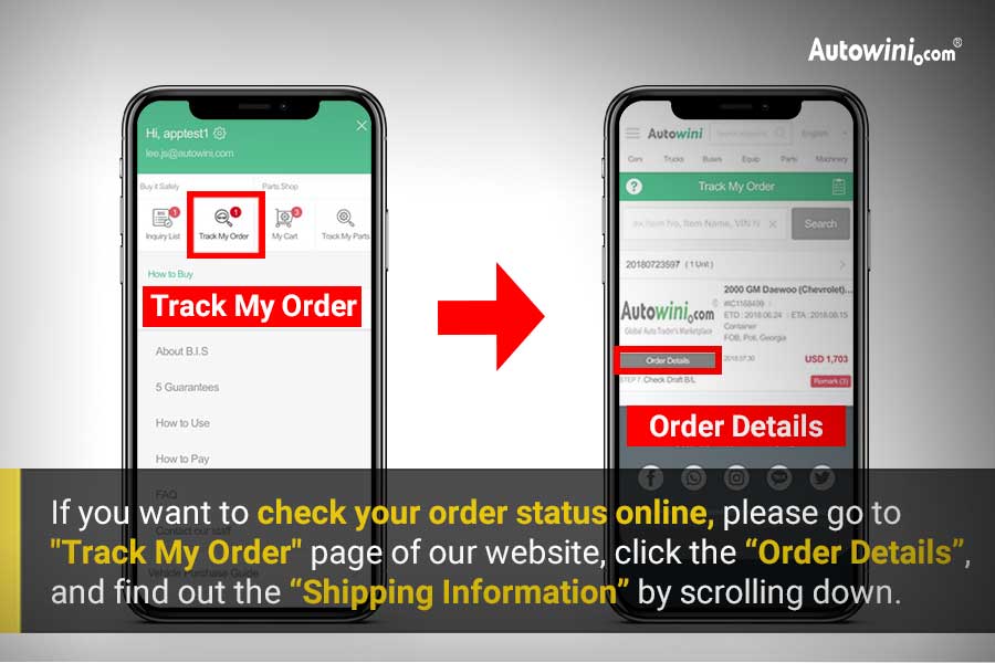 Autowini will send you the Bill of Lading (B/L) via email for you to go over the detailed list of a shipment of goods in a form of receipt. And you could check your order states on "Track My Order" page of our website!