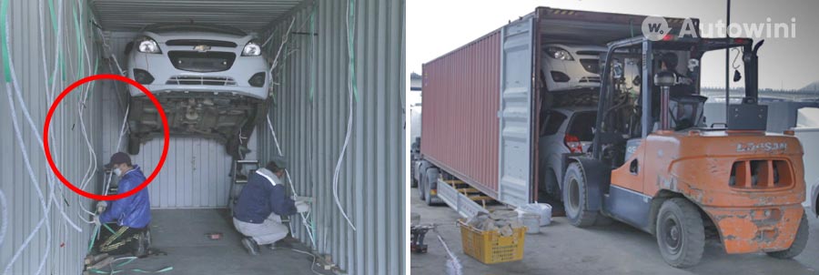 Above photo is taken at our main loading station located in Incheon, South Korea and an example of how we load vehicles in a 40HQ container. Your car will be placed inside a container and strapped down securely during the journey. So it reduces the risk of damage, loss, and theft than RoRo.